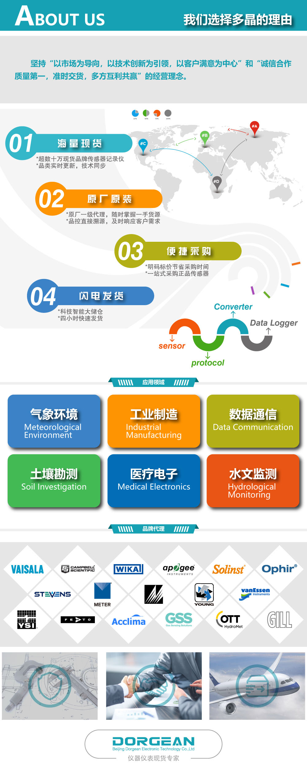 北京多晶電子科技有限公司(Beijing Dorgean Electronic Technology Co., LTD)是一家從事電子與光學(xué)儀器儀表先進(jìn)服務(wù)的授權(quán)代理和經(jīng)銷(xiāo)公司,可在氣象、水文、環(huán)境監(jiān)測(cè)、空氣質(zhì)量分析、土壤檢測(cè)等領(lǐng)域?qū)δ脑O(shè)施和過(guò)程進(jìn)行測(cè)試、測(cè)量、分析和控制。我們與Meter、Temtop、Acclima、Hash(HACH)、RM.YOUNG、Met One、Apogee、TSI、YSI、Femto、Hukseflux、Delta-T、GILL、Alphasense、Geonor、Ophir、Solinst等全球知名廠商建立了第三方技術(shù)推廣服務(wù)授權(quán)。我們及時(shí)準(zhǔn)確地掌握行業(yè)信息,在廠家的大力支持下已經(jīng)成功地為數(shù)千家機(jī)構(gòu)和企業(yè)提供了各種產(chǎn)品、咨詢(xún)、解決方案和服務(wù)。