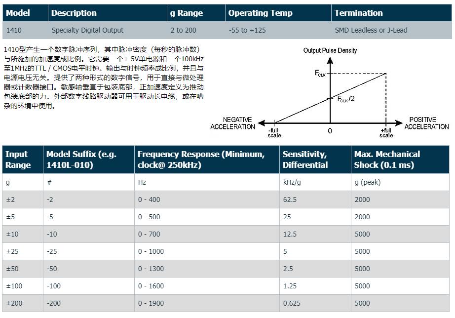 1410型產(chǎn)生一個(gè)數(shù)字脈沖序列,其中脈沖密度(每秒的脈沖數(shù))與所施加的加速度成比例。它需要一個(gè)+ 5V單電源和一個(gè)100kHz至1MHz的TTL / CMOS電平時(shí)鐘。輸出與時(shí)鐘頻率成比例,并且與電源電壓無(wú)關(guān)。提供了兩種形式的數(shù)字信號(hào),用于直接與微處理器或計(jì)數(shù)器接口。敏感軸垂直于包裝底部,正加速度定義為推動(dòng)包裝底部的力。外部數(shù)字線路驅(qū)動(dòng)器可用于驅(qū)動(dòng)長(zhǎng)電纜,或在嘈雜的環(huán)境中使用。