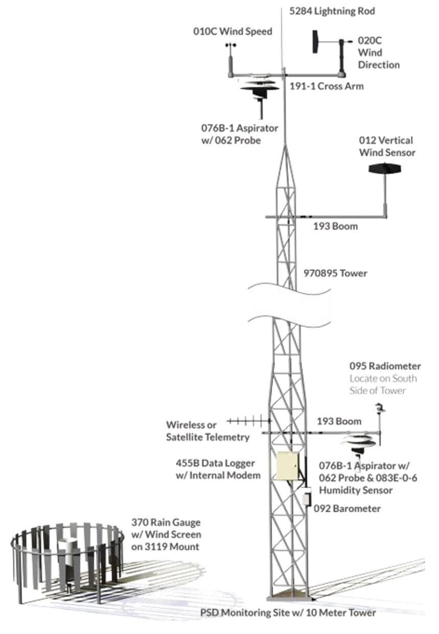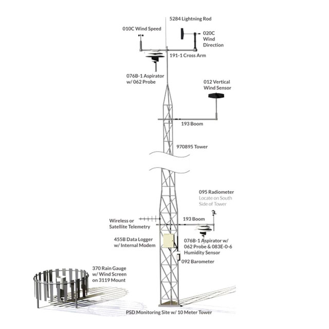空氣質量系統包括性能兼容的傳感器、電纜、安裝硬件、10 米傾斜塔和數據采集系統。氣象站可以由交流或直流電源或可選的太陽能系統供電。