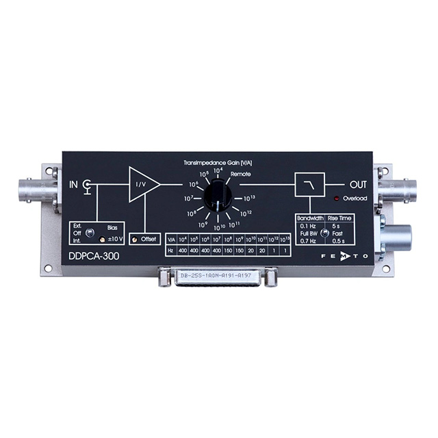 可調亞飛安放大器 DDPCA-300 是各種低噪聲跨阻放大器的新成員。非凡的設計實現了最低 0.2 fA/√Hz 和 0.4 fA 峰峰值的出色輸入噪聲值。