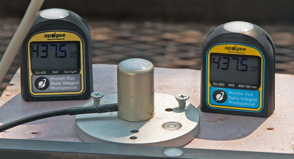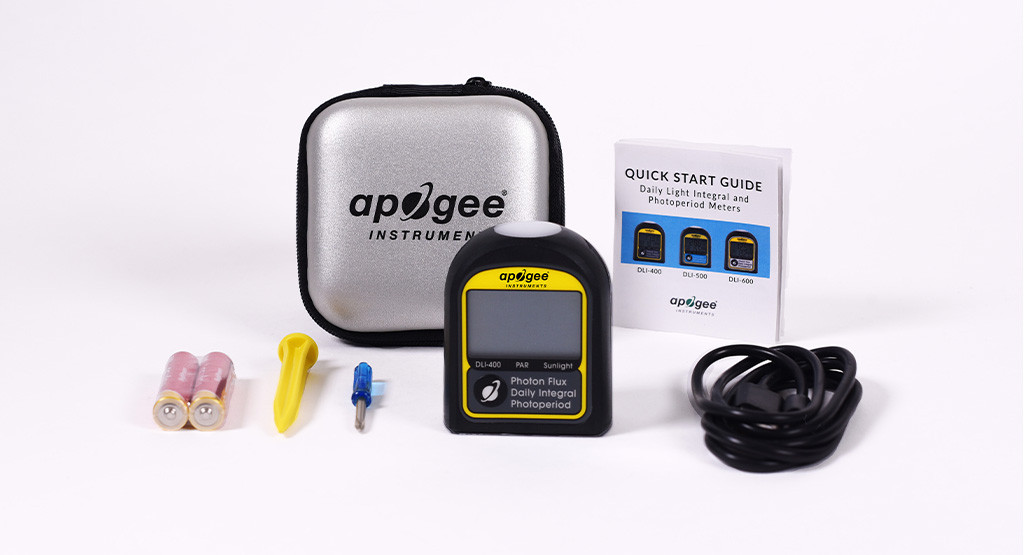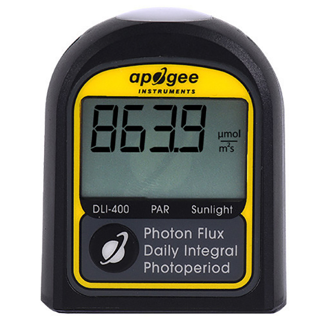 DLI-400 日光計是2022 年的新產品,用于抽查光合有效輻射(PAR;400–700 nm)水平并測量日光積分(DLI) 和光周期。DLI-400 是一種低成本選項,僅在陽光和某些寬帶光源下準確。PAR、DLI 和光周期影響植物的生長和發育,通常在溫室和生長室中測量它們以幫助進行光照管理和決策。DLI是指24小時內入射在一個平面上的PAR或擴展PAR(ePAR)的總量,單位為每天每平方米的摩爾數。光周期是 24 小時內 PAR 或 ePAR 入射的總時間,以小時 (h) 為單位表示。