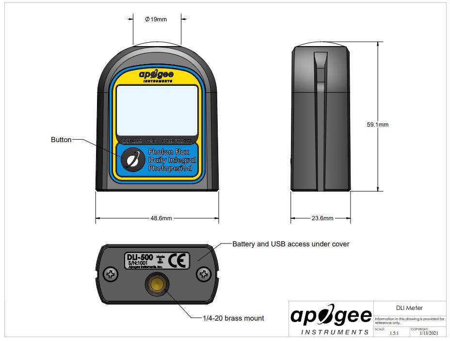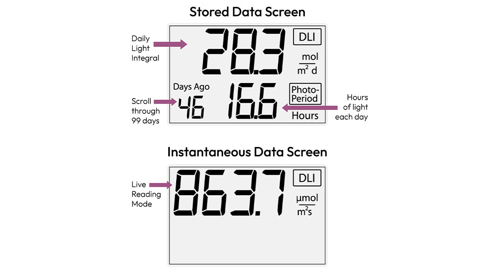 堅固耐用且隨時可用: DLI-500 堅固耐用,防護等級為 IP65,可承受惡劣和潮濕的環境,可以隨身攜帶進行抽查,直接放置在任何水平表面上,或通過連接到常用的相機三腳架、夾具或使用底部的標準 ?-20 螺紋端口進行樁定。DLI 儀表由鑄造丙烯酸擴散器(過濾器)、光學過濾器、光電二極管、信號處理電路和安裝在 ASA 塑料外殼中的 LCD 顯示屏組成。每個 DLI 包裝都包括儀表、一個保護性手提箱、兩節 AAA 電池、一個快速入門說明指南、一把螺絲刀、一個便于安裝的土壤釘和一根 USB-C 電纜,用于將儀表存儲的數據作為 CSV 文件下載到計算機。