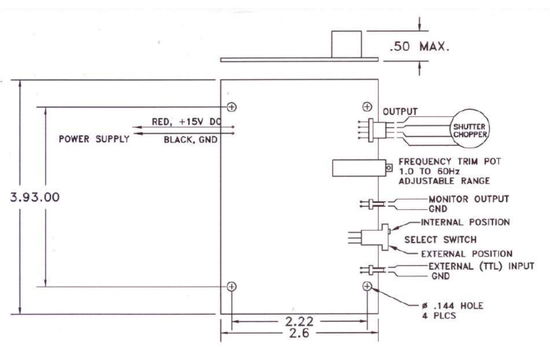 在內(nèi)部模式下,快門(mén)充當(dāng)可調(diào)節(jié)的低頻(0.5 至 50 Hz)光學(xué)斬波器。內(nèi)部振蕩器和多圈電位計(jì)控制激光快門(mén)葉片的位置。內(nèi)部振蕩器的最小頻率穩(wěn)定性為 0.1%。
