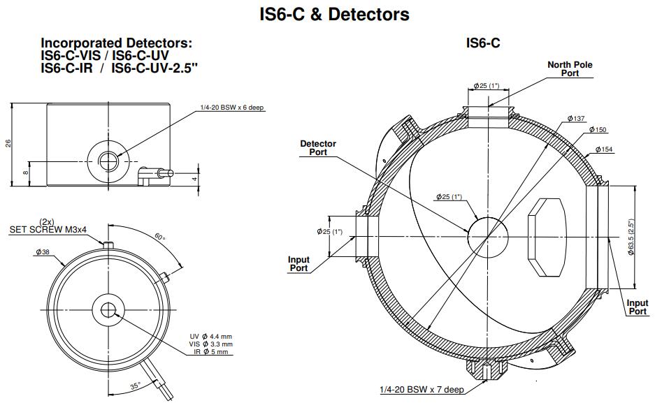 IS6-C-UV 是一個 6 英寸積分球(內部 5.3 英寸),帶有用于準直 (C) 光束的硅探測器。IS6-C-UV 帶有一個 UV 檢測器,校準范圍為 200 至 1100nm,可測量高達 1W 的功率。