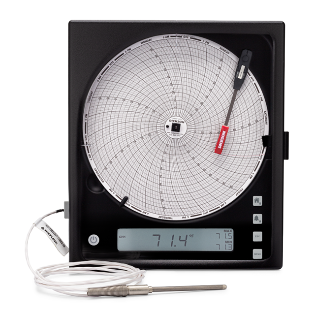 美國DICKSON KT8-40 8英寸(203 毫米)圖表記錄儀提供所有圖表記錄儀中較大的分辨率。現在具有可更換傳感器,校準您的圖表記錄儀比以往任何時候都更容易。所有圖表記錄儀均配有 8 英寸大圖表和用戶可選擇的記錄時間范圍(1 天、1 周)和范圍。