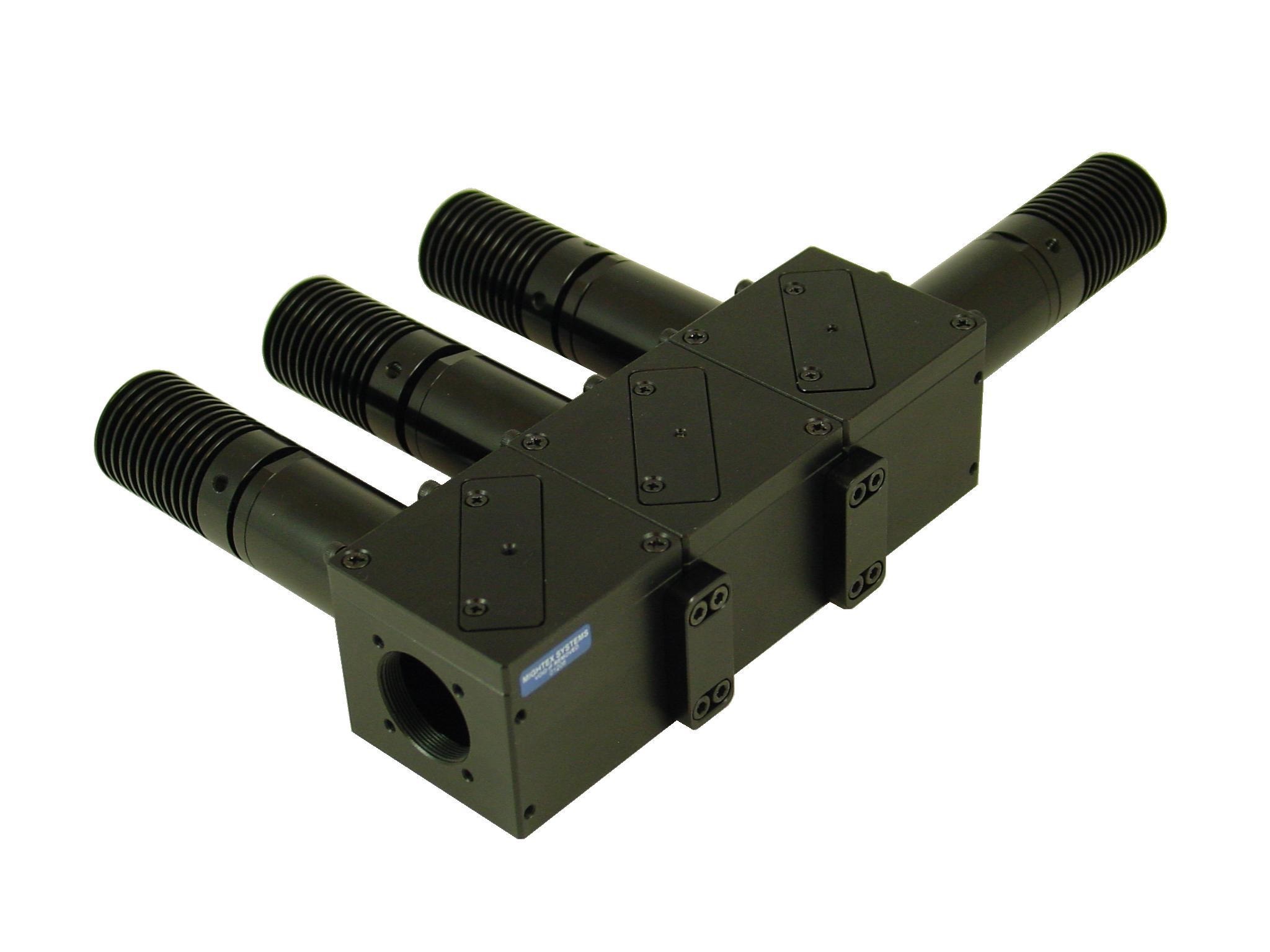 光束耦合器包括多個安裝孔和螺紋,因此可以很容易地集成到系統(tǒng)中。每個輸入端口都具有精細的 2 軸傾斜調(diào)整功能,以允許 LED 準直器源相對于系統(tǒng)光軸精確對準。此外,還提供了一個堅固的鎖定機構,以保持長期對齊。此外,還提供適配器,用于與主要品牌的顯微鏡耦合。