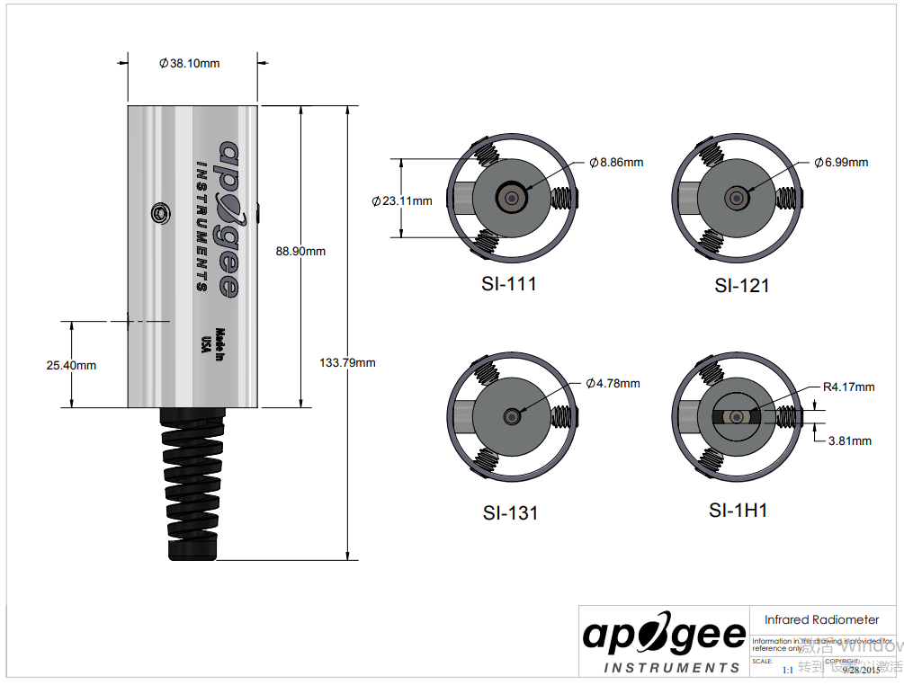 SI-411具有SDI-12數(shù)字輸出和高質量電纜,端接在預鍍錫尾纖引線中,便于連接到數(shù)據(jù)記錄器和控制器。該傳感器具有22°半角度視場,響應時間為0.1秒。為了更好地安裝,已經(jīng)更新了遮陽板設計(有關更多信息,請參閱產品圖片)。典型的應用包括用于植物水分狀況估計的植物冠層溫度測量、用于確定結冰條件的路面溫度測量以及用于能量平衡研究的地表(土壤、植被、水、雪)溫度測量。傳感器包括IP68 不銹鋼電纜連接器,距離頭部30厘米,以簡化傳感器的拆卸和更換,便于維護和重新校準。SI-411-SS設計用于安裝遠地點AM-250商用安裝支架。
