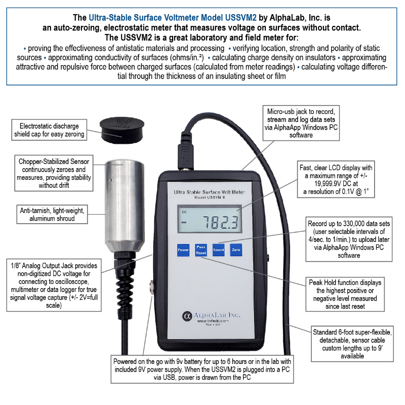 USSVM2 型穩定表面電壓表采用傳感器快門/開關技術,可提供長期穩定性而無漂移。該技術還消除了由于帶電空氣分子(空氣離子)導致的錯誤或偏移讀數。該傳感器有一根 29 英寸的可拆卸電纜,可延長至 9 英尺。