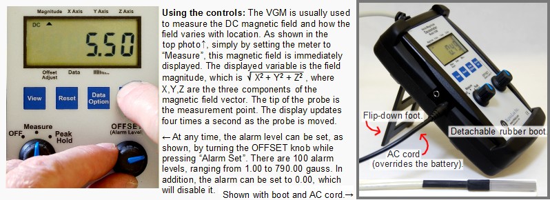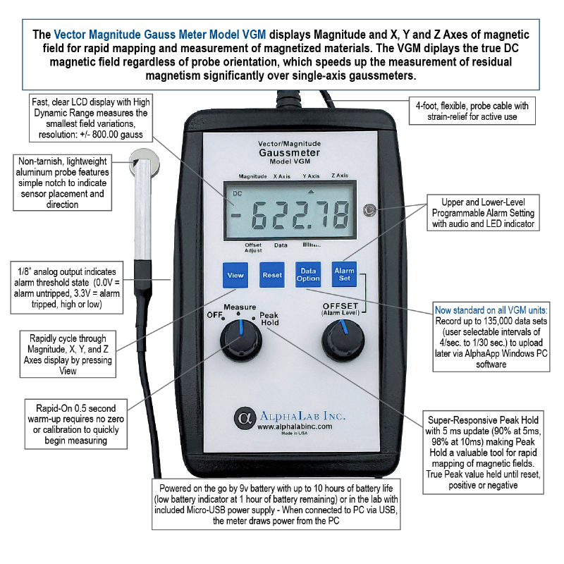 VGM 型號專為快速識別和測量磁化區(qū)域而設(shè)計。它是一個直流高斯計,在探頭末端帶有 X、Y 和 Z 傳感器。它顯示場的大小以及 X、Y 和 Z 分量,同時顯示所有變量的實際值和峰值。此外,只要場強(qiáng)大于您設(shè)置的值,警報就會響起并亮起,并且“邏輯高”信號會出現(xiàn)在輸出插孔。該儀表出廠時即可使用,包括一個 9 伏電池、USB 電源適配器和校準(zhǔn)證書。該儀表經(jīng)過優(yōu)化,可測量磁化零件;它的 799.99 高斯范圍不足以測量大多數(shù)永磁體的表面。