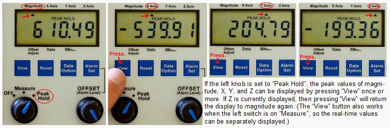 可用于長期峰值檢測。所有四個峰值都將保留存儲(并在遇到更高峰值時繼續(xù)更新),直到您重置它們。隨時顯示幅度、X、Y、Z的峰值和當(dāng)前值。