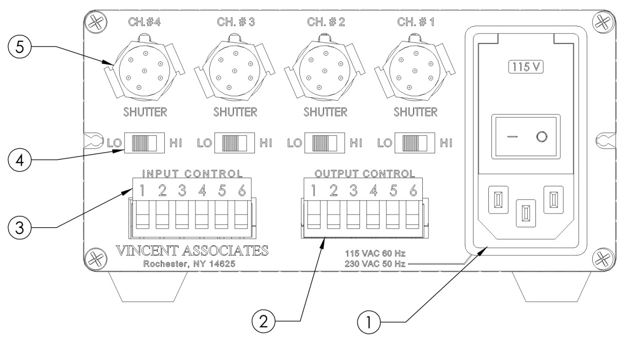 | LO/HI 選擇滑動開關 (4) | “HI” 位置允許為 35 mm 和更大的快門選擇合適的脈沖能量。“LO” 位置適用于 25 mm 和更小光圈的快門。每個通道一個。 |