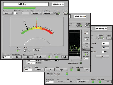 您可以選擇我們提供的任意感溫探測器測量從幾微瓦到 30 千瓦的激光器功率。我們使用我們制造的靈敏度高的一款熱電堆探測器,即 XLP12-3S-H2 型,生成了左圖所示的軟件屏幕。我們選擇的是“示波器”模式,您可以在此監控功率,并同時查看實時功率讀數(0.404 瓦)、條形圖和帶狀圖。通過此屏幕還可訪問量程、觸發器、自動刻度和很多其他監視功能。