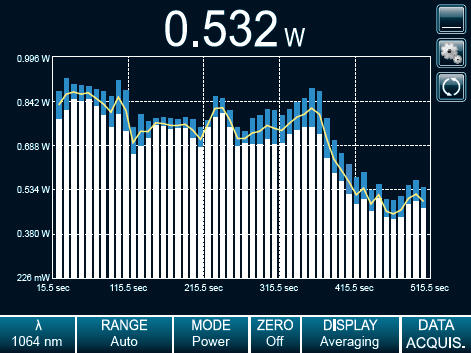 這個(gè)非常特別的模式特別適用于顯示激光器隨時(shí)間的變化趨勢。設(shè)置每批的點(diǎn)數(shù),然后讓 MAESTRO 確定每批的最小值和最大值。每批的平均值之后會(huì)出現(xiàn)一條黃色曲線,其在屏幕上顯示為條形。條形白色和藍(lán)色部分(分別對(duì)應(yīng)最小值和最大值)相差越大,激光器的穩(wěn)定性越差。