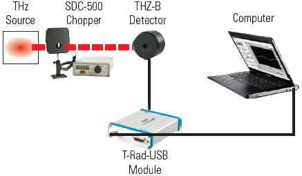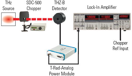 如果您需要測量信號可能淹沒在寬帶噪聲中的較低功率級別(即小于 5 μW),我們推薦使用此模擬設置選項。由 T-RAD-ANALOG 供電的模擬 THZ-B-DA 探測器電壓輸出連接至鎖定放大器輸入,SDC-500 斬波器的同步輸出則連接至參考輸入。鎖定放大器將鎖定斬波頻率,可通過撥入較長積分時間測量均方根很低的電壓。該電壓除以電壓響應度 (V/W) 即等于輻射源的功率。