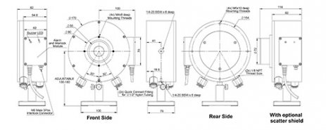 The 16K-W-BB-55 is a water cooled thermal power/energy laser measurement sensor for very high powers with a 55mm aperture. It can measure power from 100W to 16,000W. It has a deflecting cone and annular absorber that withstands high power densities to 10kW/cm2. It covers the spectral range from 0.8 - 2μm and 10.6μm. 16K-W-BB-55 sensor has a module mounted on the sensor near the output cable with over temperature LED, loud audible signal and M8 3 connector interlock. The sensor comes with a standard 5 meter cable for connecting to a meter or PC interface.