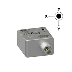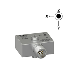 Miniature Industrial Triaxial Accelerometer, Side Exit 4 Pin Mini-MIL Connector, Follows Cartesian Phase Coordinate System, 10 mV/g, ±10%