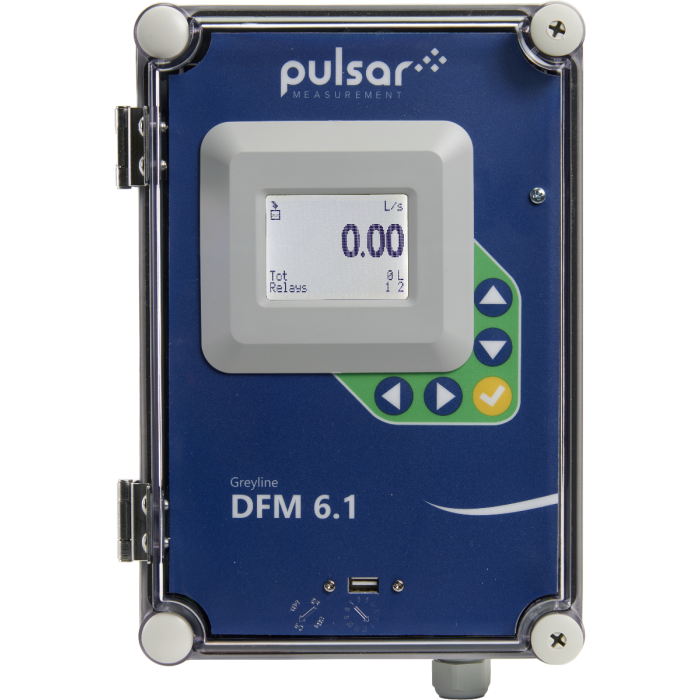 The easy–to–use 5-key configuration system on the DFM 6.1 Doppler Flow Meter makes setup and installation quick, simple, and easy. The unit features a large digital flow rate display with a totalizer, isolated 4-20 mA output, 26-million-point data logger, and two programmable control relays.