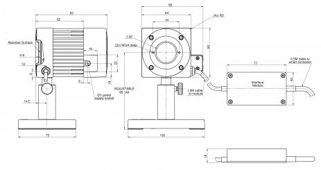 The BeamTrack series F150A-BB-26-PPS laser measurement sensor measures laser beam size and position well as power and energy. It has a 26mm aperture and can measure beam size to 5% accuracy and position to 0.1mm accuracy. It measures power from 40mW to 150W and energy from 20mJ to 100J. It has the spectrally flat broadband coating and covers the spectral range from 0.19 to 11μm.The sensor comes with a 1.5m cable that connects it to the electronic box, and another 0.5m cable that connects the box to a Meter or PC interface.