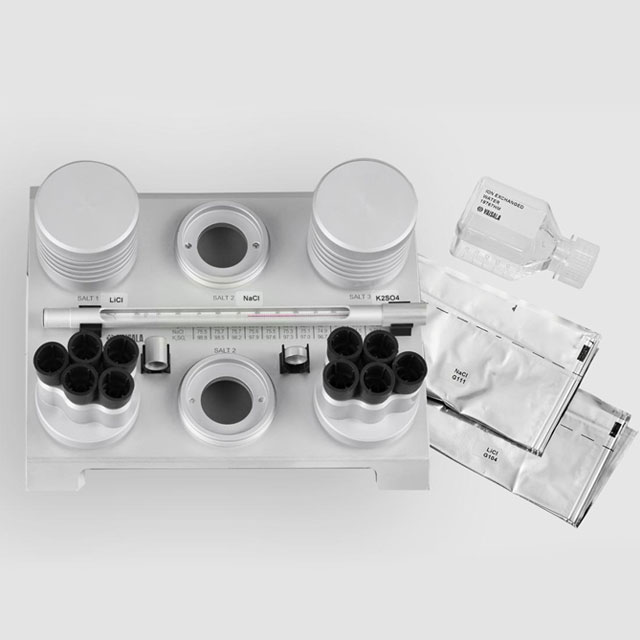 HMK15 works based on the fact that a saturated salt solution produces a definite relative humidity in the air above it. The reading of humidity probe or transmitter can then be adjusted accordingly. This generally accepted and reliable method is used in many laboratories to calibrate humidity meters. There are usually two or three salt solutions used, with different calibration salts selected depending on the application.