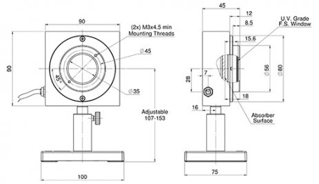 The L40(500)A-LP2-DIF-35 is a thermal power/energy laser measurement sensor for high power density and very small diameters lasers. It has a 35mm aperture and can measure from 300mW to 40W continuously and to 500W intermittently. It can measure energy from 100mJ to 2,000J. The sensor is able to measure high power lasers of up to 4kW with a 3.5mm diameter beams by measuring the energy of 0.4 - 4s exposure to the laser. The high damage threshold LP2 absorber together with the diffuser cover the spectral range from 0.44 to 2.2μm. The sensor comes with a standard 1.5 meter cable for connecting to a meter or PC interface.