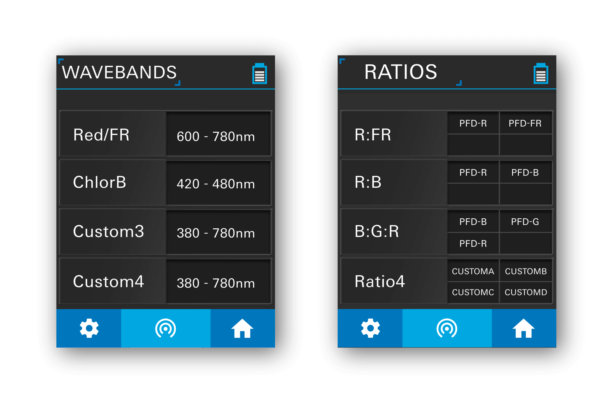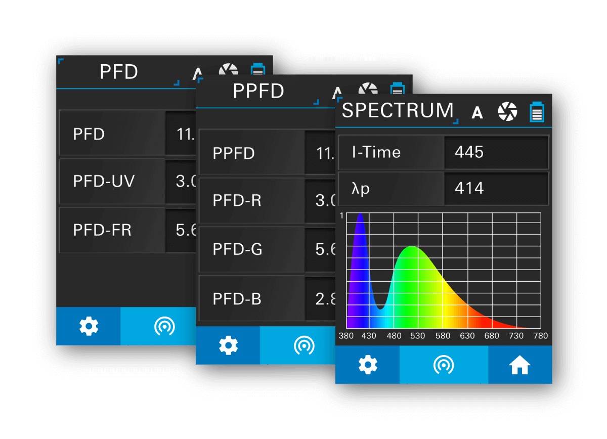 | Measuring Modes | Measuring Modes: PPFD, PFD, Spectrum (chart), Logging, and Grid |