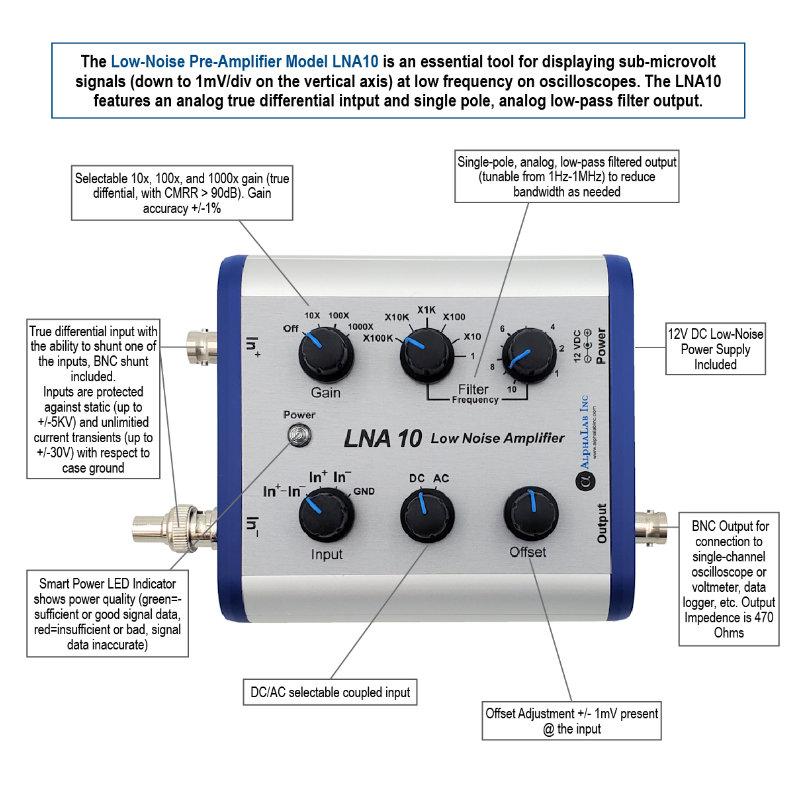 With this preamp, sub-microvolt signals can be displayed on scopes which typically only go down to 1mV/div on the vertical axis. The preamp includes an analog true differential input and an analog low-pass filter (tunable 1Hz-1MHz). Input-referenced RMS noise spectrum for f >100Hz is 4 nV/√Hz or less, so for example, even with 1000 x gain, total noise from 100 Hz to 1000 Hz is less than 1 div peak-to-peak on a 1mV/div vertical scope setting (assuming a low-impedance input). Most oscilloscopes are designed to display high-frequency (fast) events that may intrinsically have noise of a millivolt or more. However, low-frequency signals have much less intrinsic noise, so a low-noise preamp and a bandwidth-limiting filter are essential for small signals at low frequency.* Most amplifiers have a white noise spectrum (a flat spectral curve) at all frequencies above ~1000 Hz. This white noise spectrum is usually specified as a certain number of nV per √Hz. However, unlike typical passive resistors, the equivalent input noise spectrum of solid-state amplifiers (in nV/√Hz) becomes higher at low frequencies. Typically the number of nV/√Hz is proportional to ~1/f for f ≤10Hz. The table below shows actual noise of the LNA 10 in various frequency ranges. At all frequencies, the LNA 10 has much less noise than typical solid-state amplifiers.