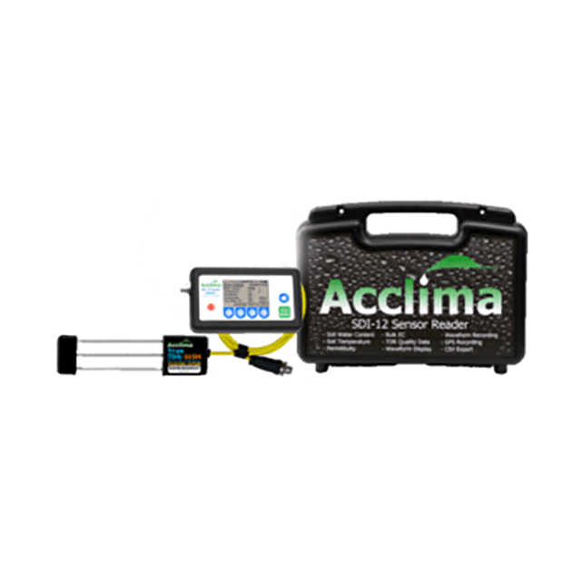 This soil moisture sensor kit contains the Acclima Sensor Reader which will read any Acclima SDI-12 soil water content sensor (TDT or TDR soil moisture sensor, probe, or meter), display the readings on an LCD screen, and (if it’s a compatible ‘Waveform Capture’ sensor) it will record and display the waveform.