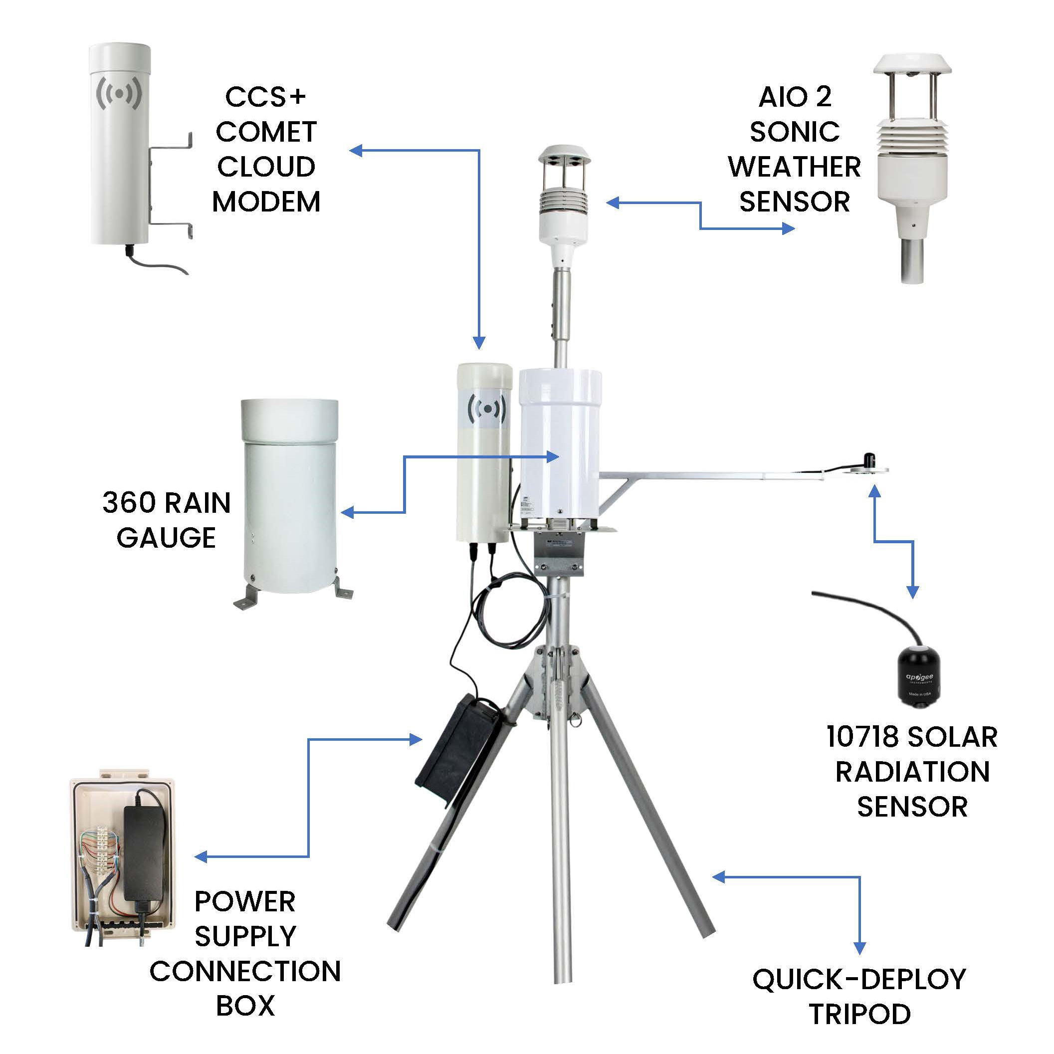 ReadyWeather is a full-featured weather station made up of Met One’s AIO 2 Sonic Weather Sensor, the CCS+ Comet Cloud Modem, 360 Precipitation Gauge, and 10718 Solar Radiation Sensor, all of which mounts to a 10′ aluminum tripod with a power supply and cable interface box. Utilize real-time cloud data viewing and retrieval on your customized web page dashboard, with automated data upload to the Cloud for remote access from any smart device or computer.
