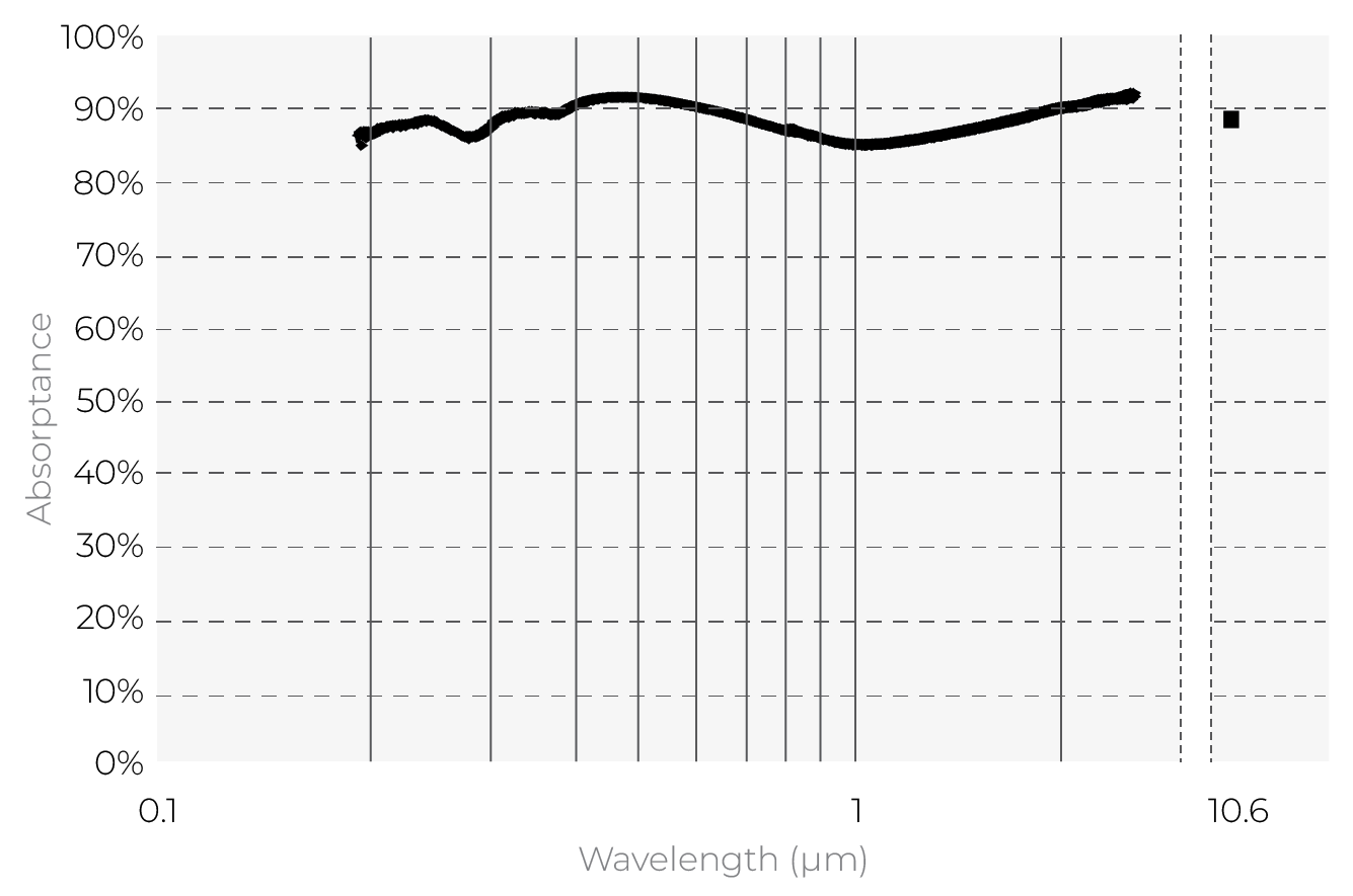 Our H absorber offers a spectral response that is both broadband and spectrally flat, making this power detector a versatile solution that can cover most laser power measurement needs. Our proprietary manufacturing method also gives this absorber good damage thresholds, for both average power density and energy density. It has a high absorption capacity and, therefore, generates a relatively low percentage of back reflection.