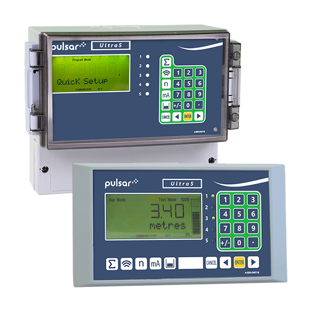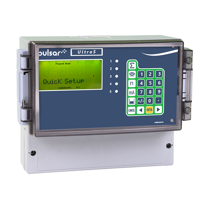 The Ultra 5 offers pump control, flow measurement, level control, volume calculations, and differential level measurement all in one compact unit. The control unit provides five assignable relays with extra-alarm options such as pump efficiency and extra pump control functions such as pump run on, pump exercising, storm and aeration control, and differential level control; the addition of further relays in open channel flow applications.